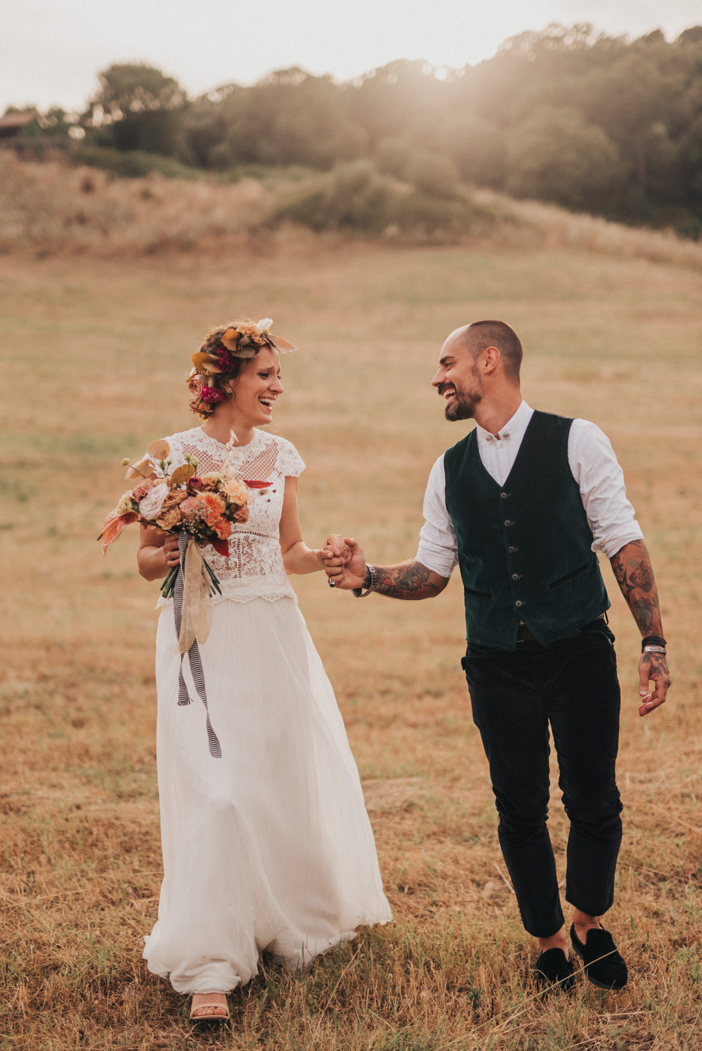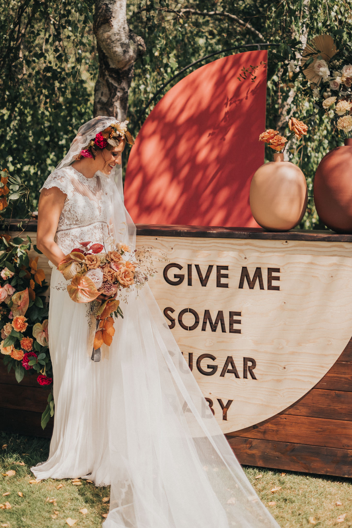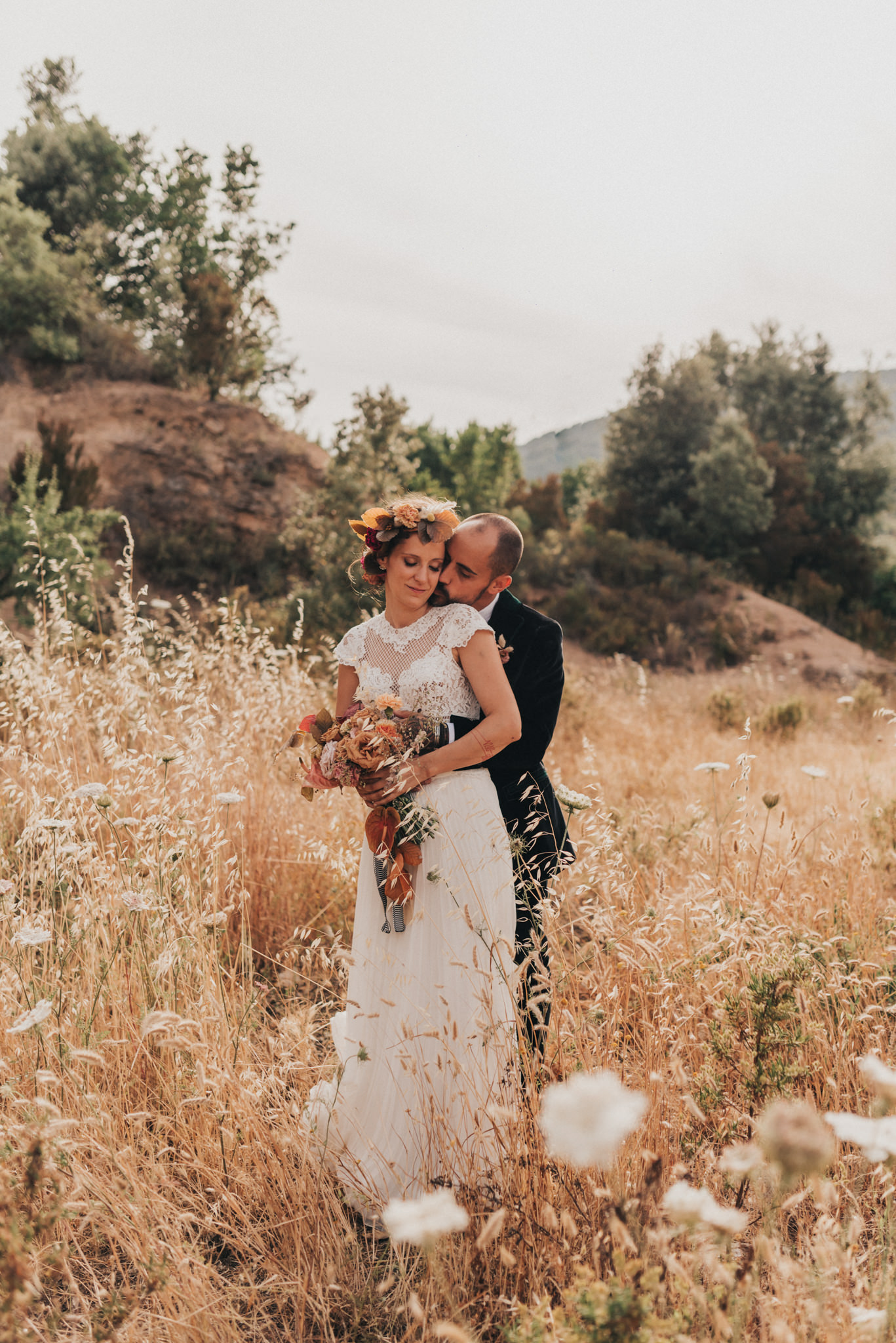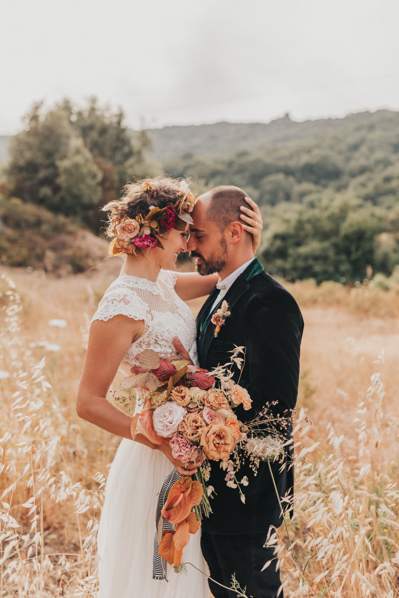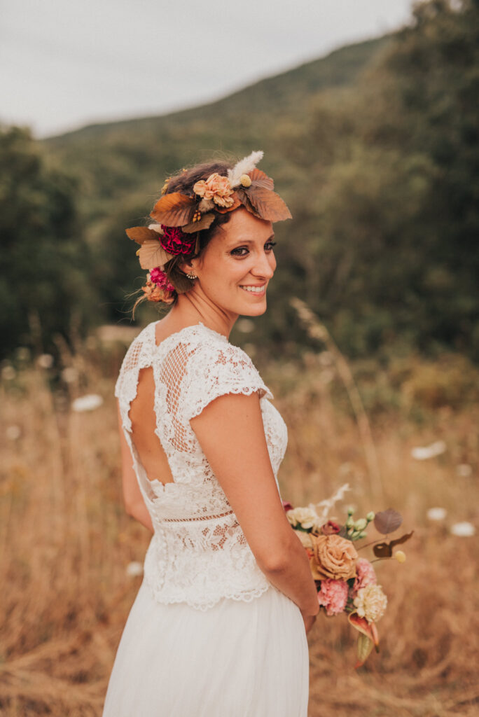 Ergänzt wurde der Look durch einen außergewöhnlichen floralen Kopfschmuck in warmen Erdtönen, der den natürlichen Stil der Hochzeit perfekt abrundete. Zusammen mit dem Brautstrauß entstand ein harmonisches Gesamtbild, das pure Authentizität ausstrahlte.