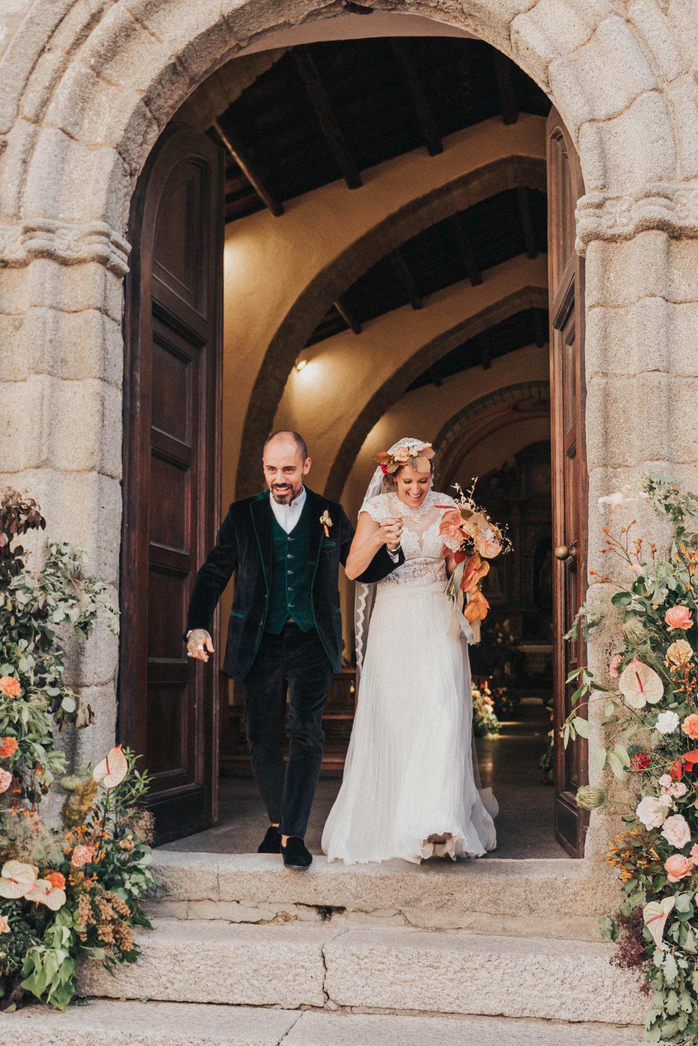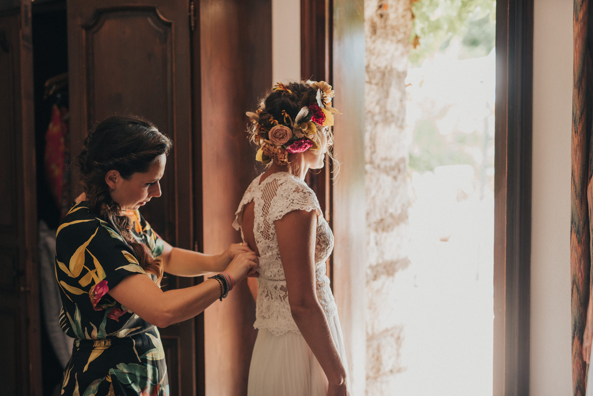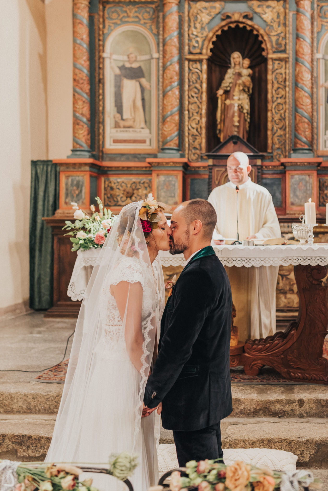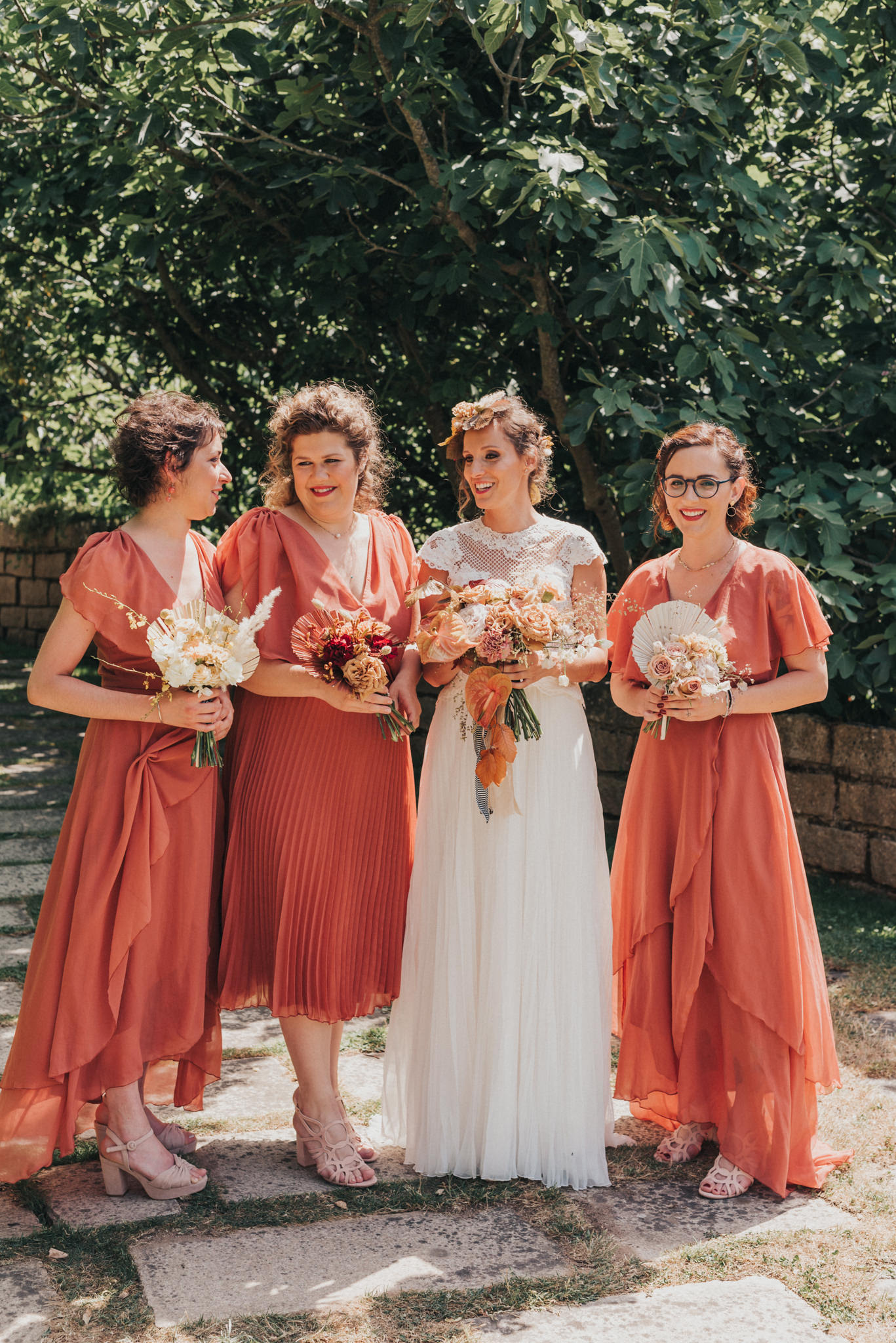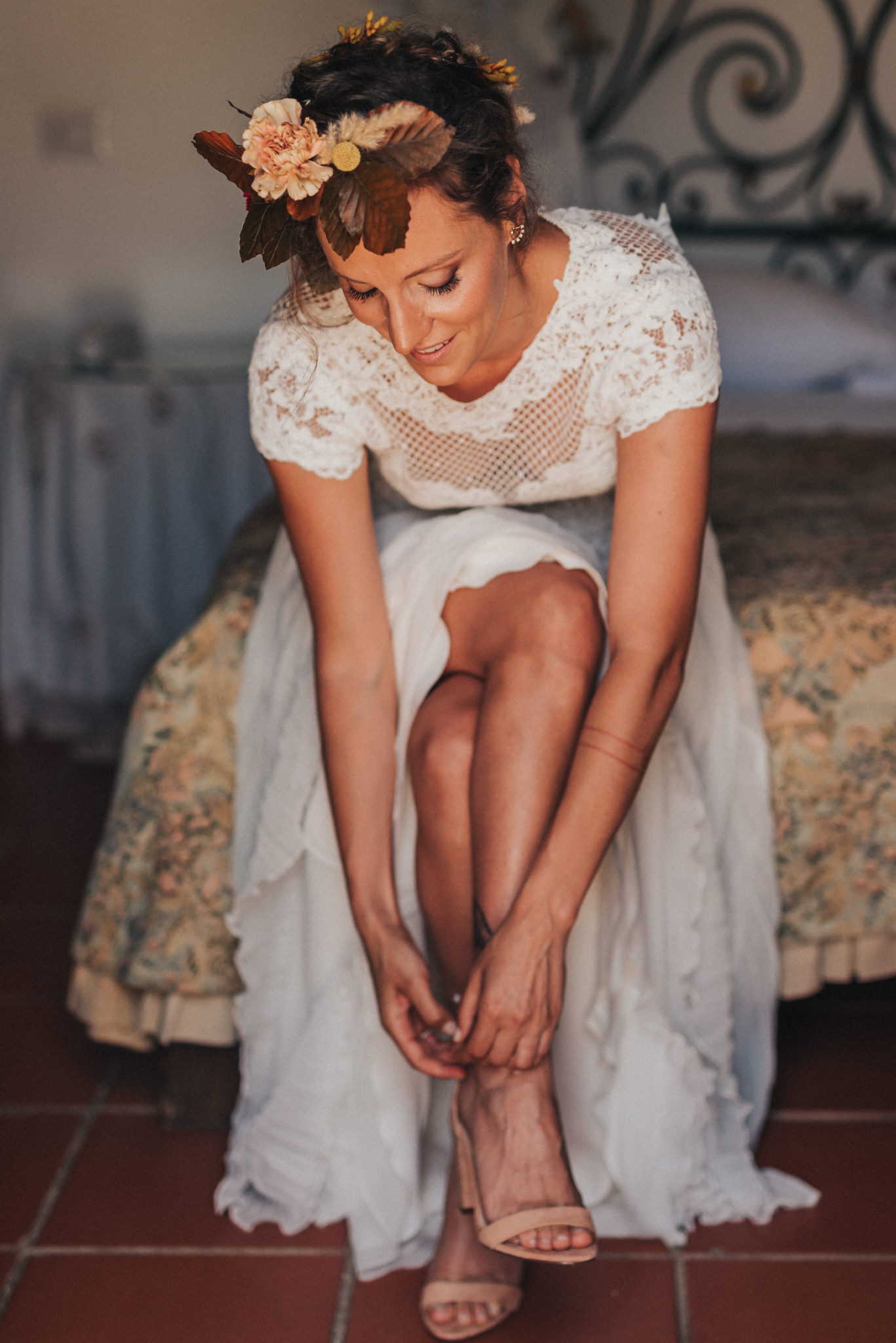 Ergänzt wurde der Look durch einen außergewöhnlichen floralen Kopfschmuck in warmen Erdtönen, der den natürlichen Stil der Hochzeit perfekt abrundete. Zusammen mit dem Brautstrauß entstand ein harmonisches Gesamtbild, das pure Authentizität ausstrahlte.