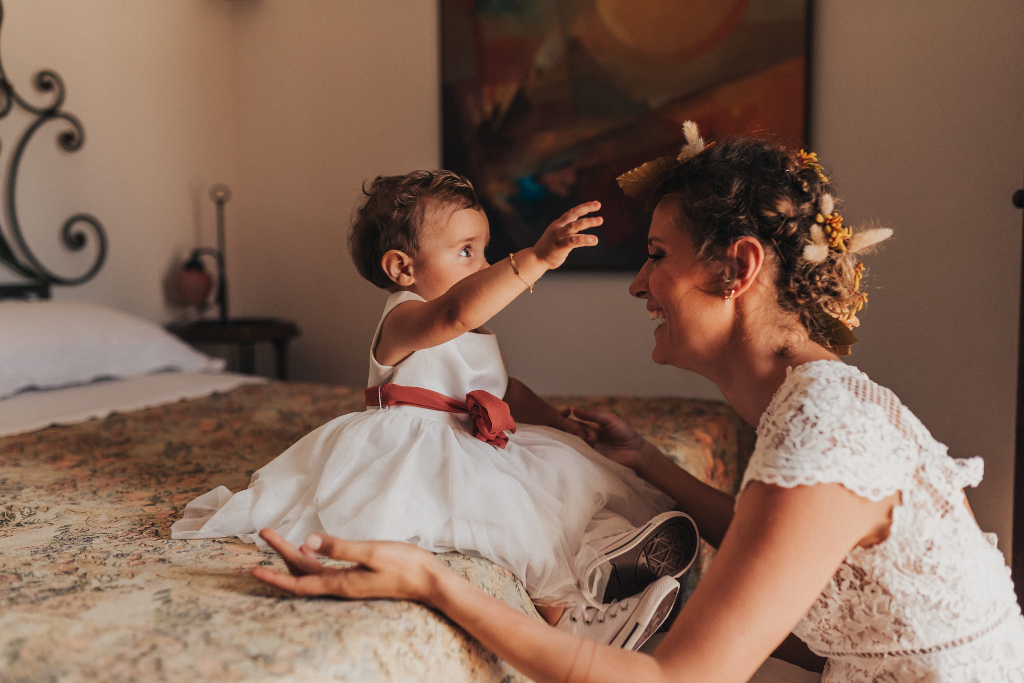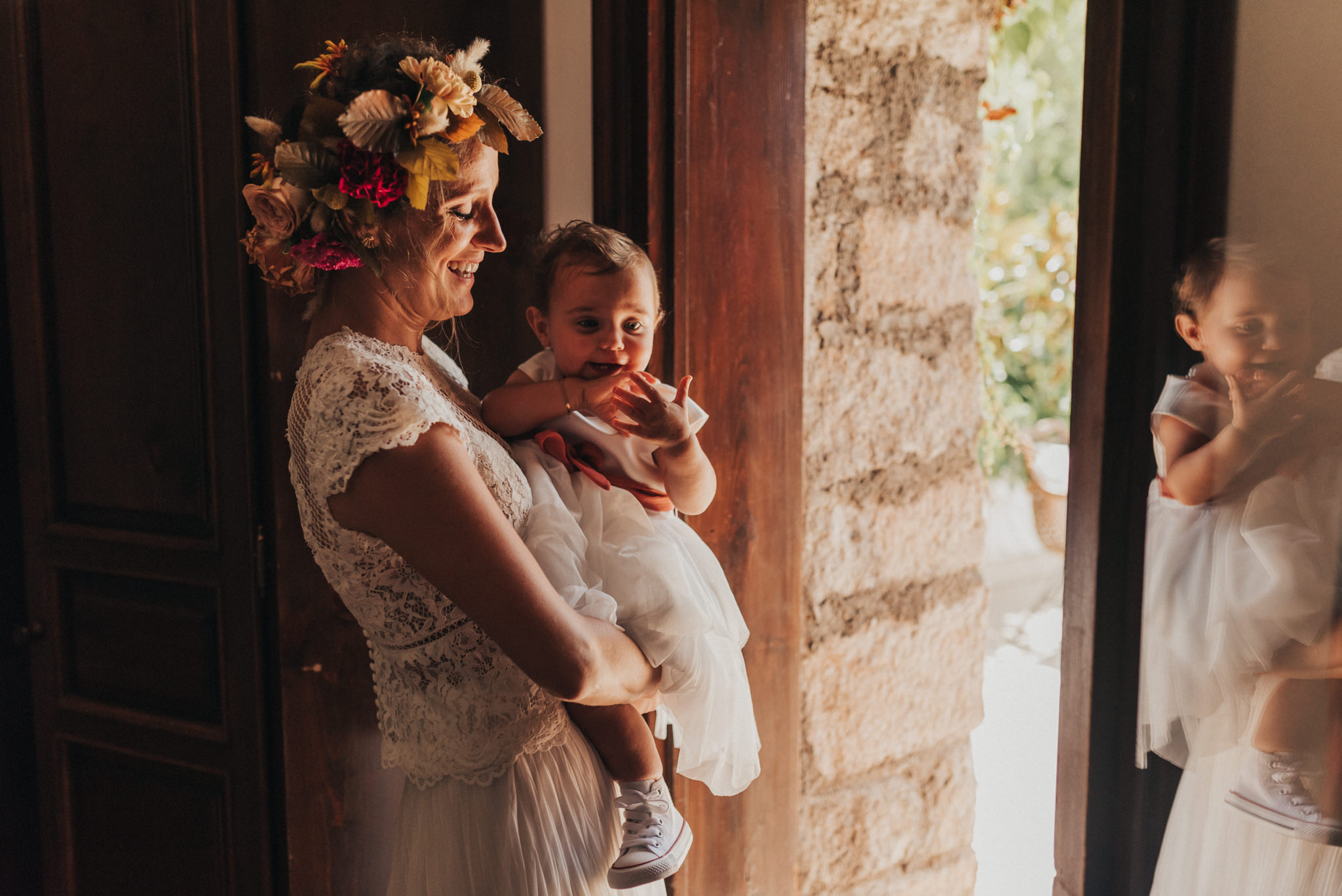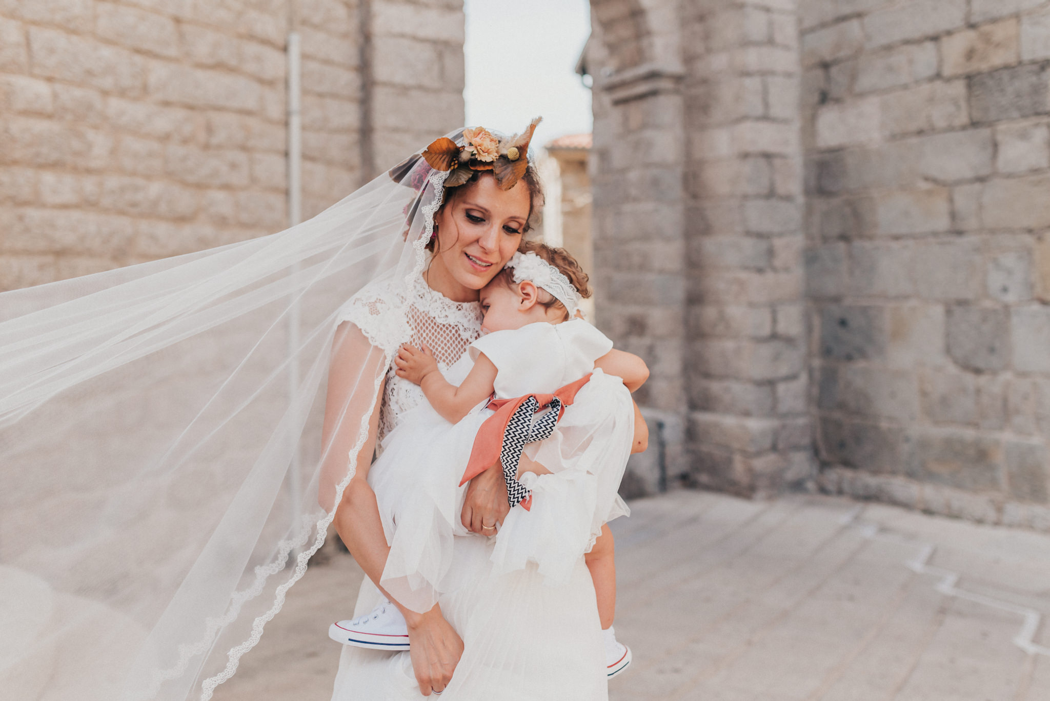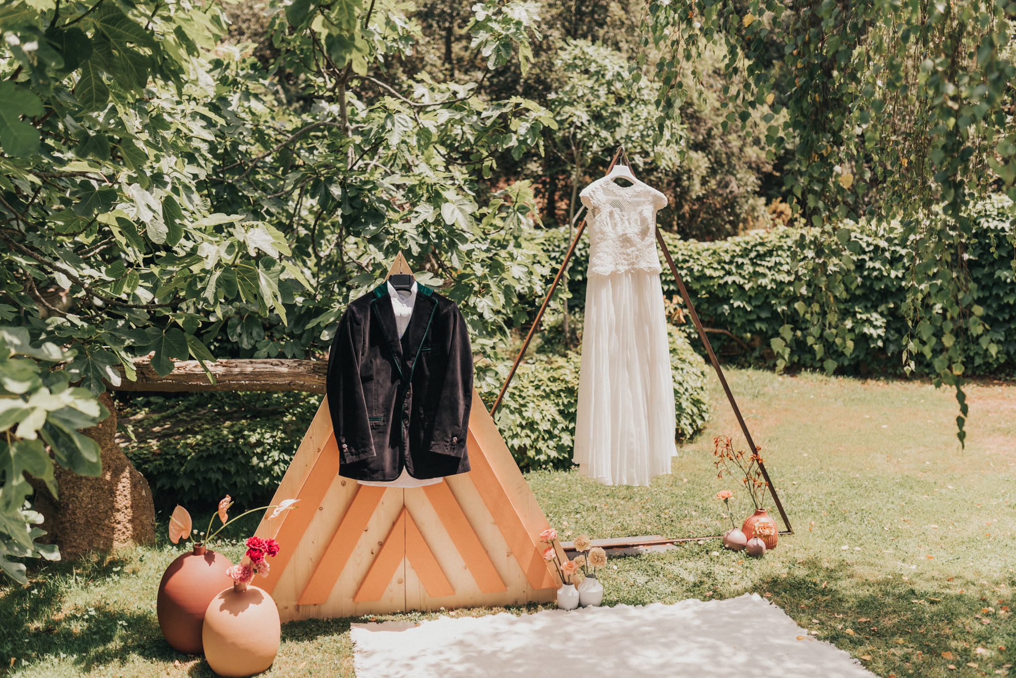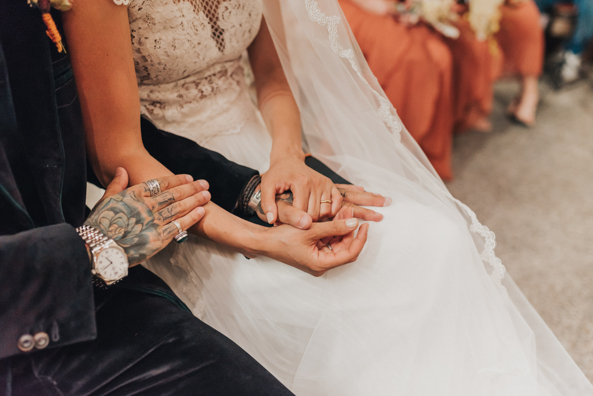 Ergänzt wurde der Look durch einen außergewöhnlichen floralen Kopfschmuck in warmen Erdtönen, der den natürlichen Stil der Hochzeit perfekt abrundete. Zusammen mit dem Brautstrauß entstand ein harmonisches Gesamtbild, das pure Authentizität ausstrahlte.