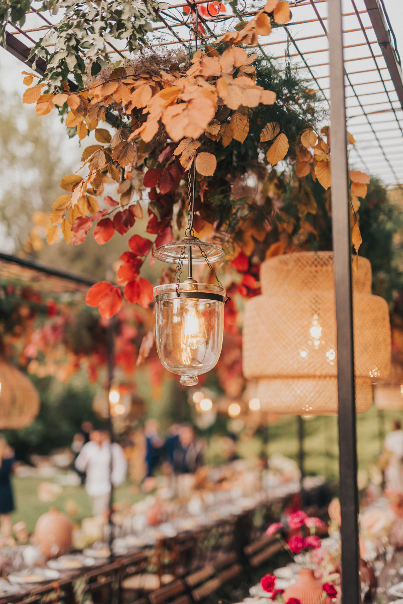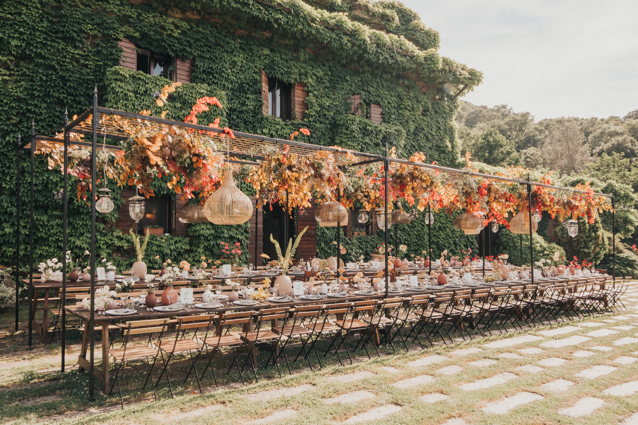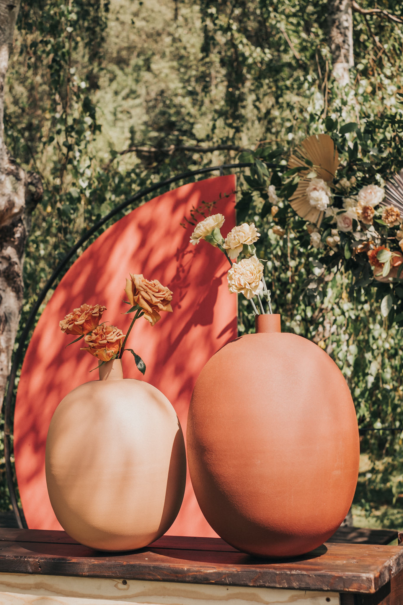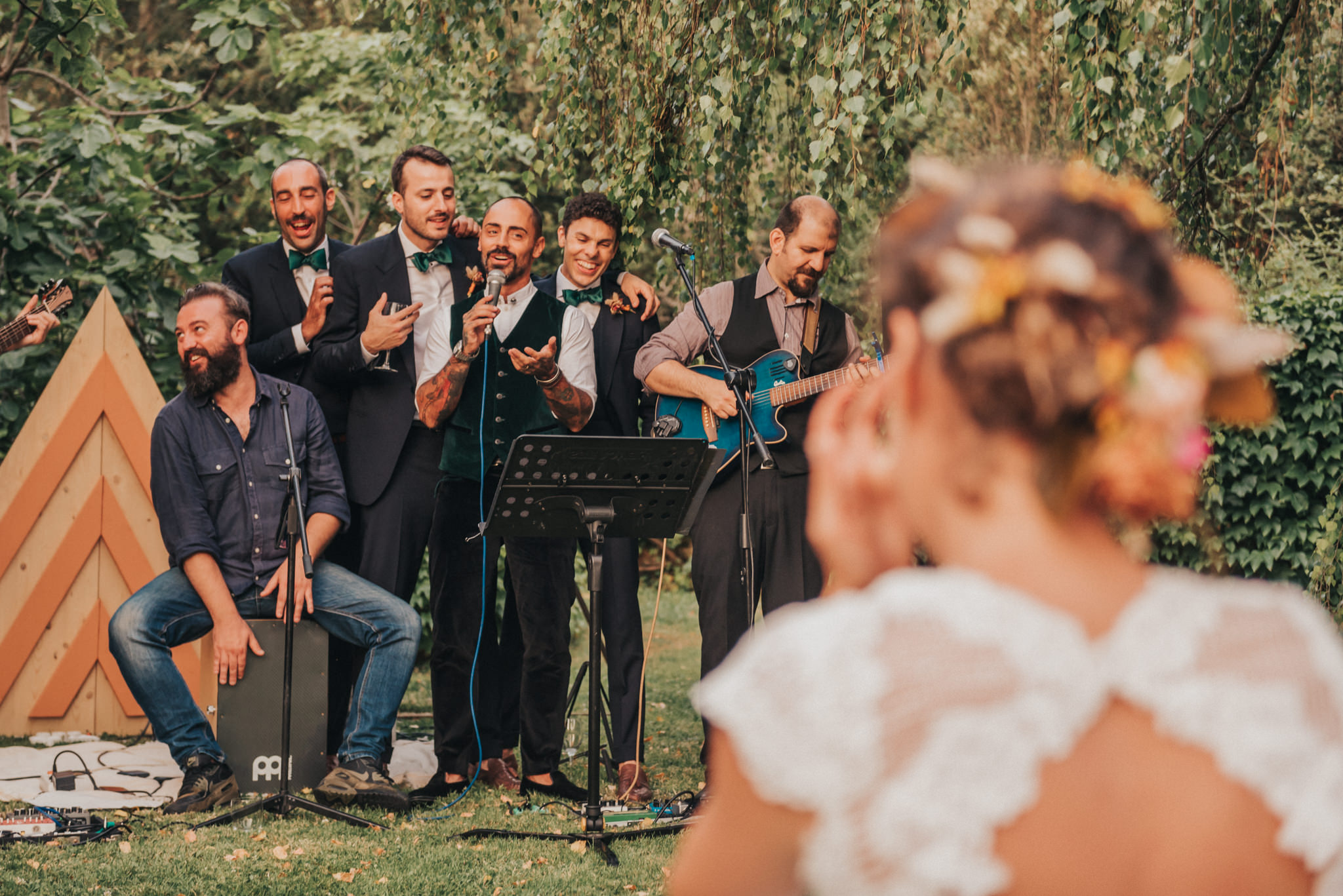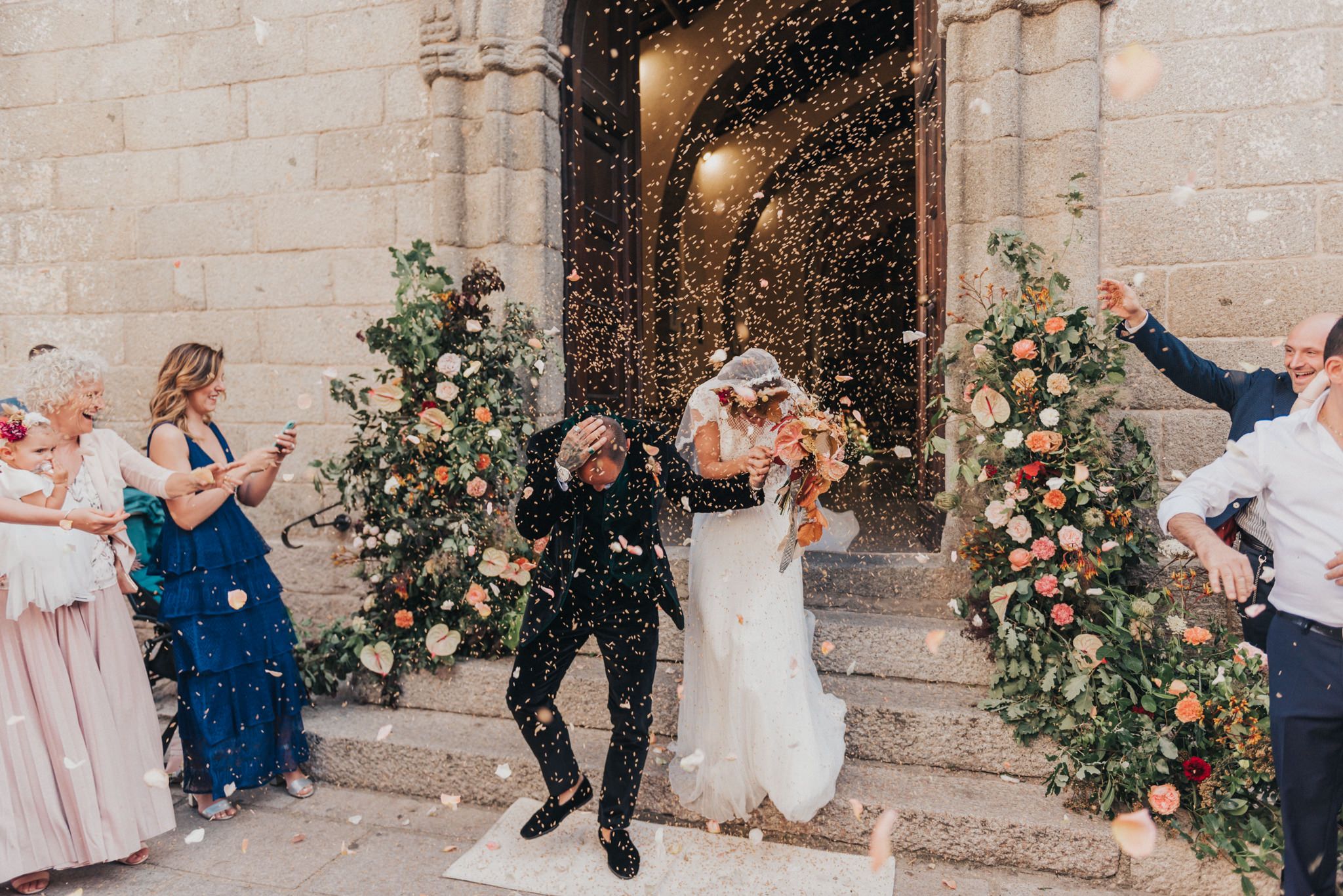 Ergänzt wurde der Look durch einen außergewöhnlichen floralen Kopfschmuck in warmen Erdtönen, der den natürlichen Stil der Hochzeit perfekt abrundete. Zusammen mit dem Brautstrauß entstand ein harmonisches Gesamtbild, das pure Authentizität ausstrahlte.