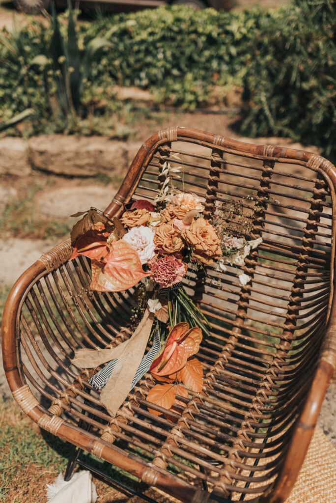 Der Brautstrauß, kreiert von Sara Cattaneo Lab, war ein Kunstwerk voller Wärme, Charakter und Natürlichkeit. In sanften Erdtönen gehalten, vereinte er zarte Rosen, Nelken und Trockenblumen zu einer harmonischen Komposition, die perfekt zum Vintage-Stil von Caterinas Kleid und der mediterranen Atmosphäre Sardiniens passte.