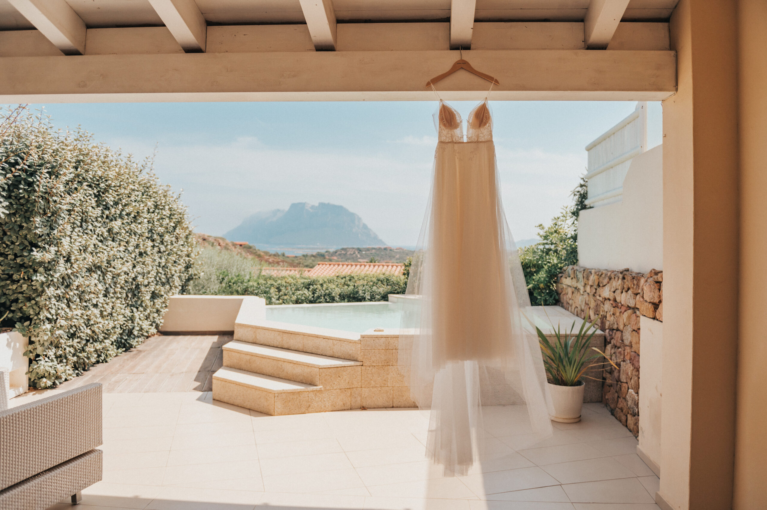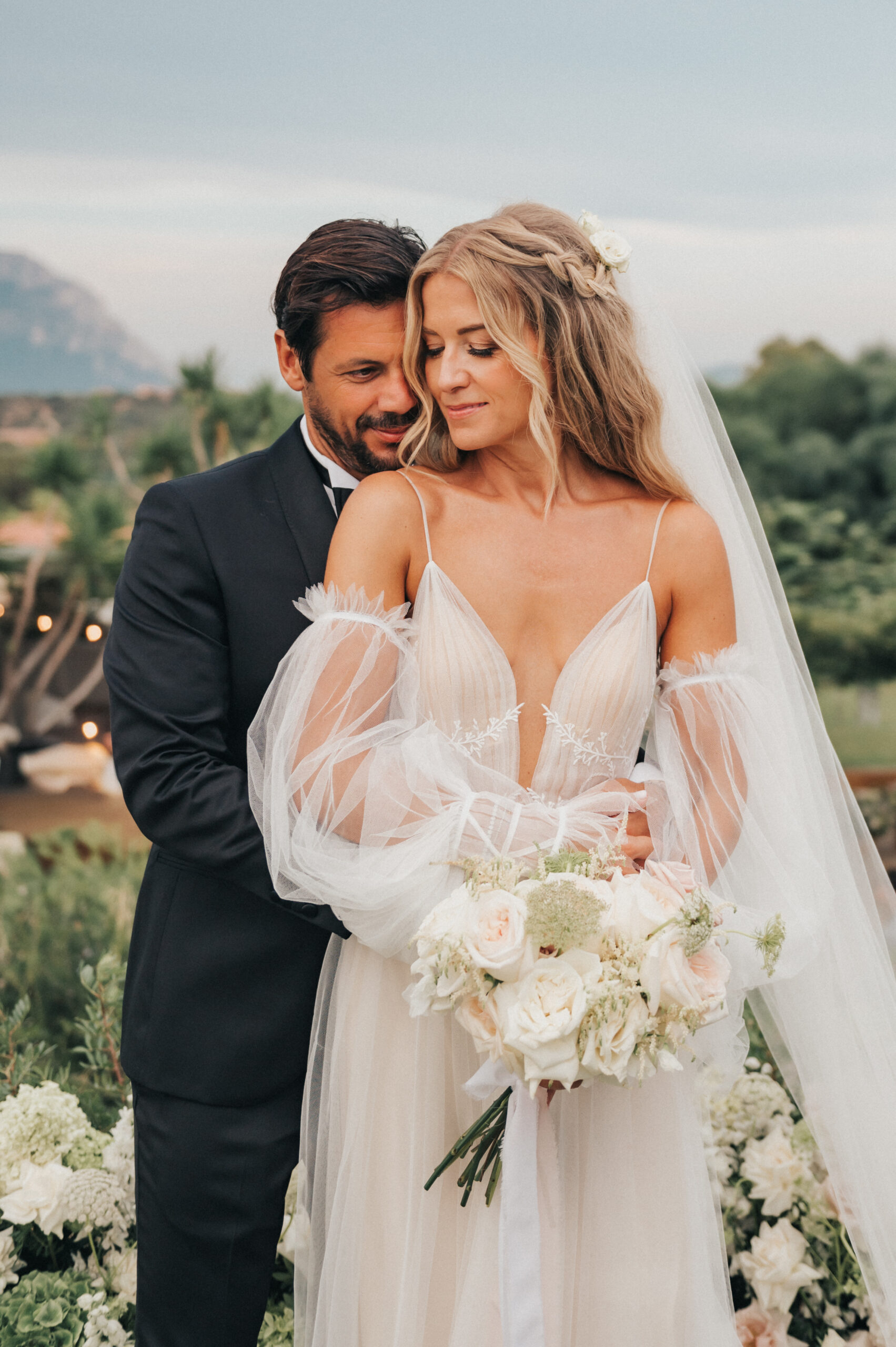 Die feinen Spitzen-Details und der weiche Tüll unterstrichen die feminine Silhouette, während die luftige Passform perfekt zur mediterranen Atmosphäre Sardiniens passte.