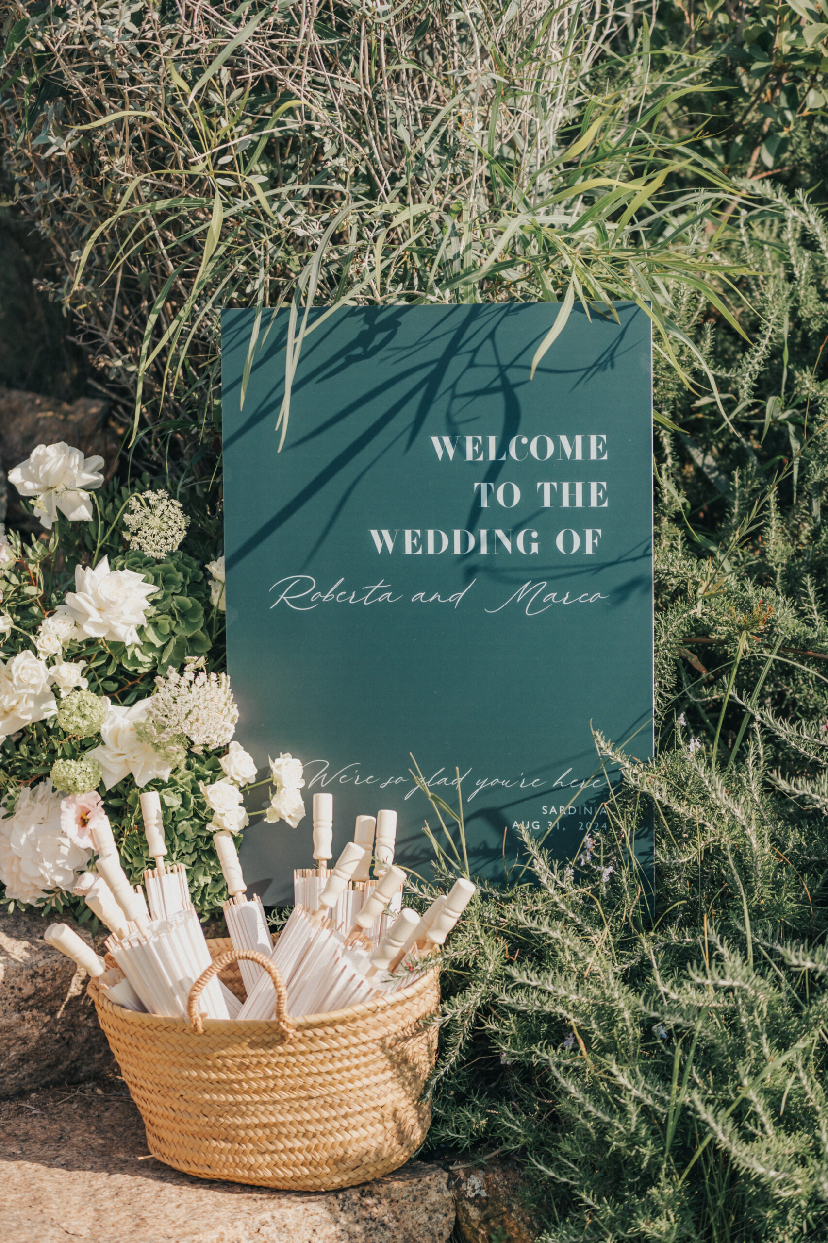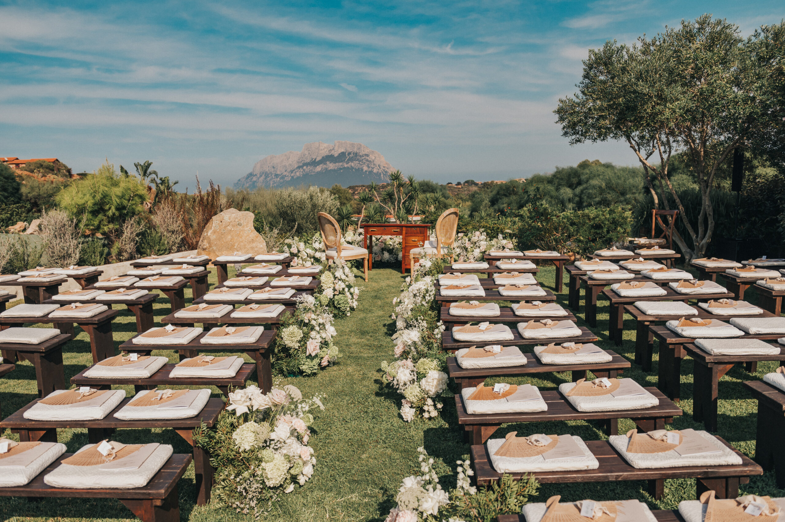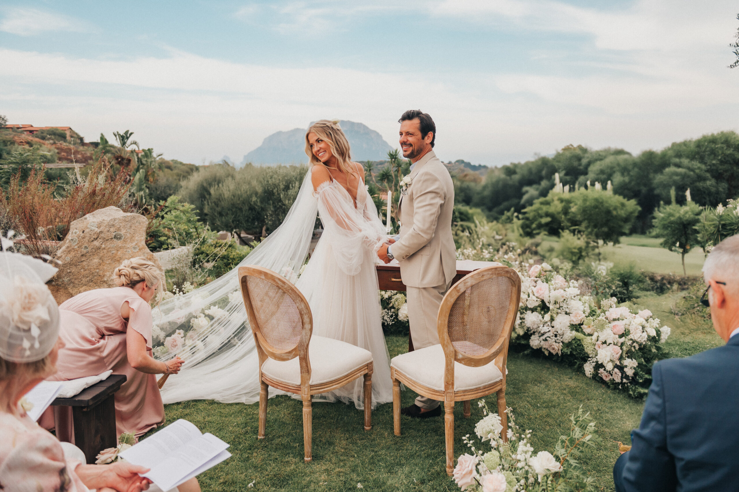 Das Hotel liegt auf einem Hügel mit Blick auf das türkisfarbene Meer der Costa Corallina und bot die perfekte Kulisse für eine elegante Feier unter freiem Himmel.