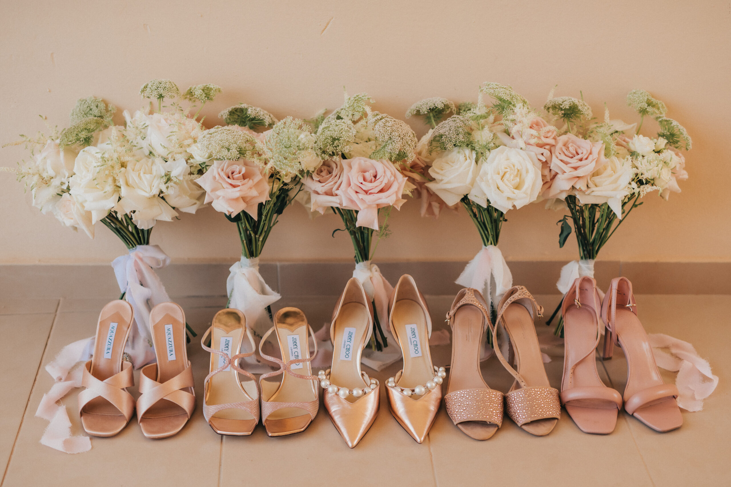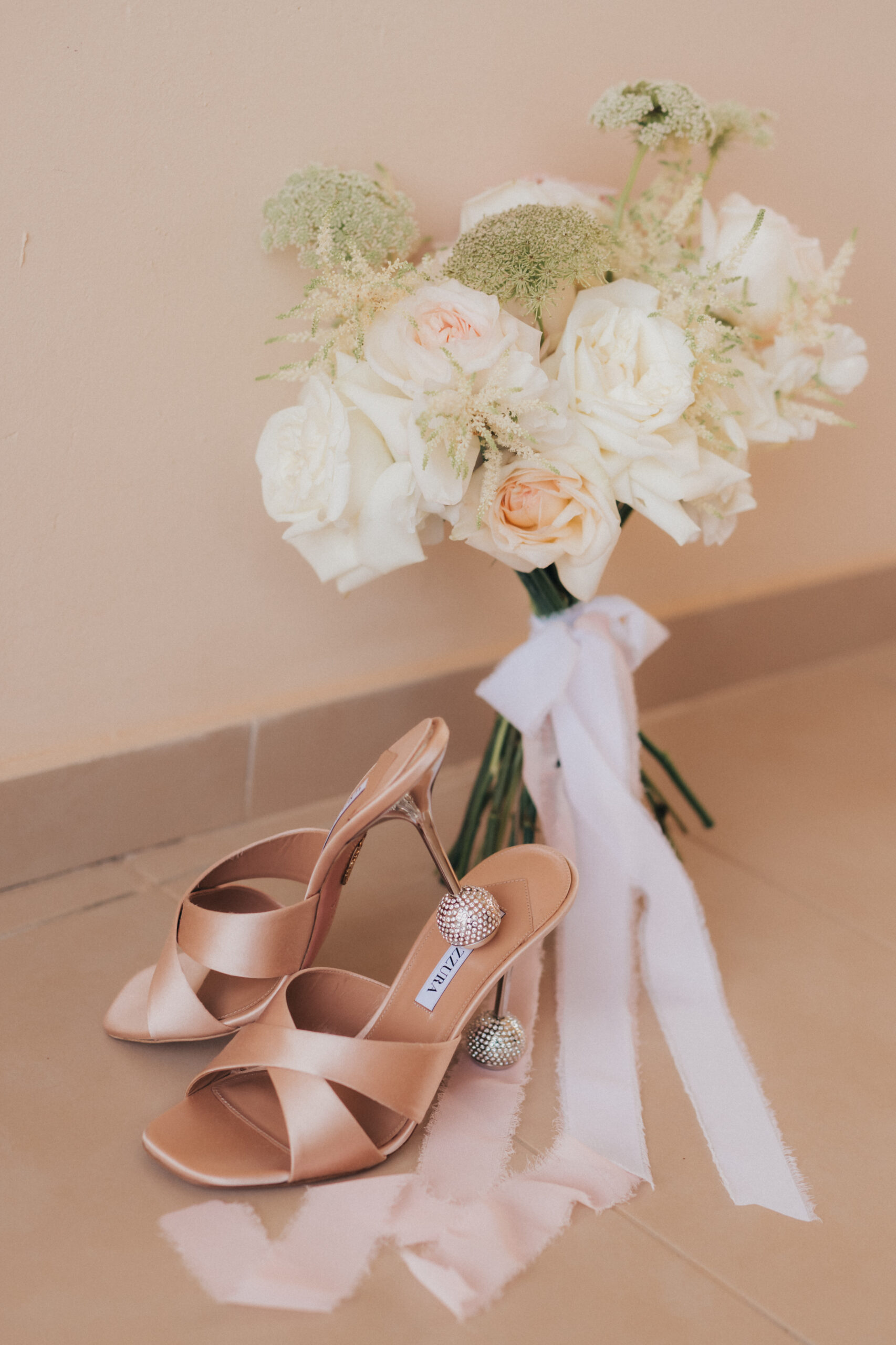 Der Strauß bestand aus zarten Rosen, Lisianthus und feinen Sommerblüten in sanften Creme- und Blushtönen – perfekt abgestimmt auf Robertas romantischen Look und das mediterrane Licht Sardiniens.